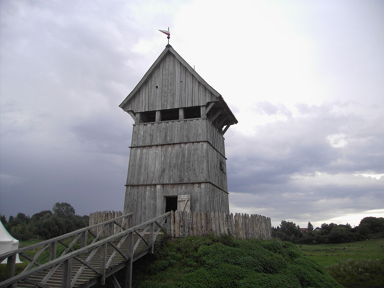 Kernburg der Turmhügelburg Lütjenburg: Erdhügel mit Palisade, Holzturm und Zugangsbrücke (Rekonstruktion)