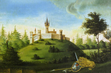 Niemand weiß, wie die Burg Wittelsbach wirklich aussah. Immer wieder haben aber Menschen versucht, sich vorzustellen, wie sie ausgesehen haben könnte. Im Stadtmuseum Aichach findest du ein Fantasiebild der Burg Wittelsbach, das ein Maler vor etwa 150 Jahren gemalt hat.