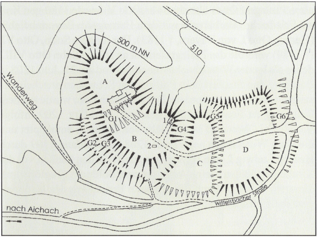 | G 1 | zugeschütteter Halsgraben der (ersten und) zweiten Burg |