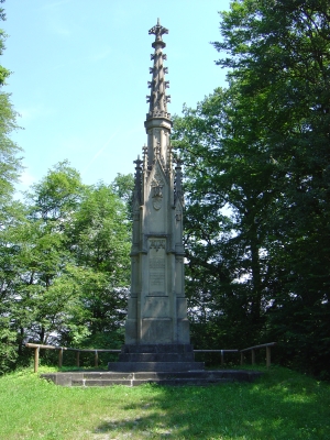 Am 25. August 1834, dem Geburts- und Namenstag Von König Ludwig I. wurde die Fertigstellung des Nationaldenkmals mit einem großen patriotischen Fest gefeiert. An den Feierlichkeiten sollen über 20.000 Menschen teilgenommen haben. Damit hatte die Wiederbesinnung auf die namensgebende Stammburg der Wittelsbacher ihren Höhepunkt erreicht. Bereits 1786 hatte der Aichacher Stadtpfarrer und Deutschordenspriester Dr. Georg Gottfried Higler anlässlich der Geburt der Prinzen Ludwig und Pius aus dem Hause Wittelsbach dort eine Feier veranstaltet, zu der er die Schuljugend nach Oberwittelsbach geführt hatte. Nachdem 1810 ein Scheibenschießen auf dem Burgplatz abgehalten worden war, gab der ehemalige Aichacher Bürgermeister Lorenz Alois Gerhauser den Anstoß zur Errichtung eines ersten Denkmals. Dieses hölzerne Denkmal, das sich am selben Platz befand wie das heutige, war an der Spitze mit einer Fahne geschmückt und trug die Inschrift: Hier stand das Stammhaus Wittelsbach. Dieser Platz bedeckt die Ruinen desselben. So drückt zwar schwer der Schutt der Zeiten das Vaterland, aber der edle Geist der Ottonen lebt nach mächtig in den Regenten Baierns. Gott segne Max Joseph, das königliche Haus und unser Vaterland Baiern. Aufwändigere Pläne, wie die des Münchner Architekten Carl von Fischer dort ein großes steinernes Löwendenkmal zu errichten, ließen sich nicht verwirklichen. Nachdem jedoch der Wunsch nach einem repräsentativen und dauerhaften Monument in breiten Kreisen der Bevölkerung immer stärker geworden war, wurde ab 1821 in ganz Bayern Geld für ein Denkmal auf Wittelsbachs Ruinen gesammelt. Den Entwurf für das neugotische Nationaldenkmal schuf der Münchner Architekt Daniel Ohlmüller. Nach der feierlichen Grundsteinlegung am 25. August 1832 konnte im folgenden Herbst mit den Bauarbeiten begonnen werden. Das 14 m hohe Denkmal wurde aus Sandstein in der Werkstätte von Hippolyt Hautmann in München hergestellt. Als Zeichen der gesamtbayerischen Huldigung sind auf den Seiten die Wappen der acht damaligen bayerischen Bezirkshauptstädte angebracht. An der südlichen Schauseite ist die Widmungsinschrift zu lesen: Seinem tausendjährigen Regentenstamme das treue Bayern | Errichtet im achten Regierungs-Jahre Koenig Ludwig des I.
