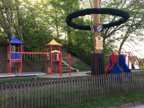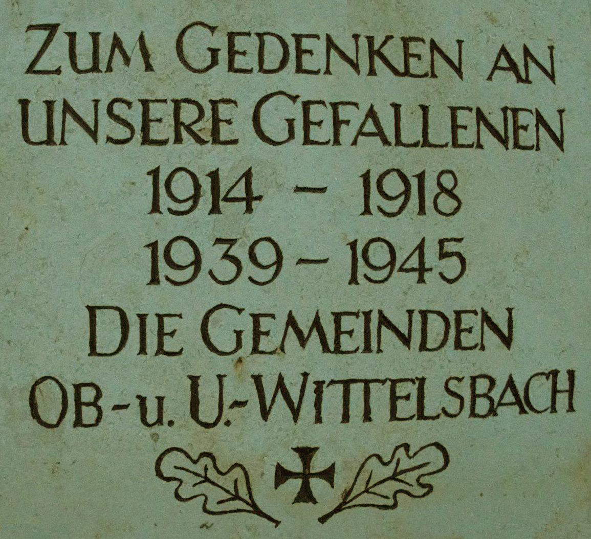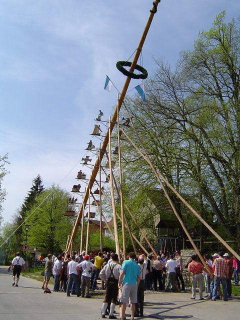 Inschrift am Maibaum: "Du Wandersmann, schau mich und meine Lanschaft an. Denk mit frohem Blick an unser Dorf Oberwittelsbach zurück." MDCCCCLXXXII